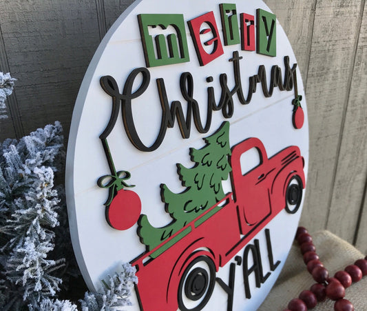 Wooden Red Truck Christmas Wreath, Merry Christmas Y'all Door Hanger