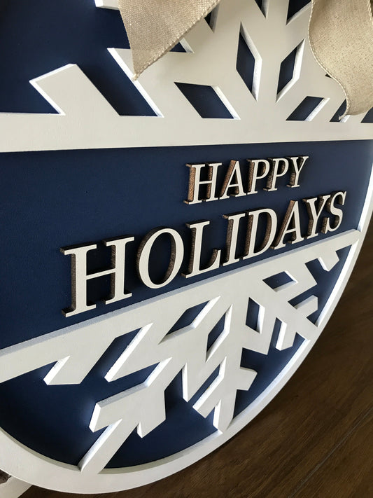 Wooden, Snowflake Winter Wreath, Happy Holidays Door Hanger in Blue and White