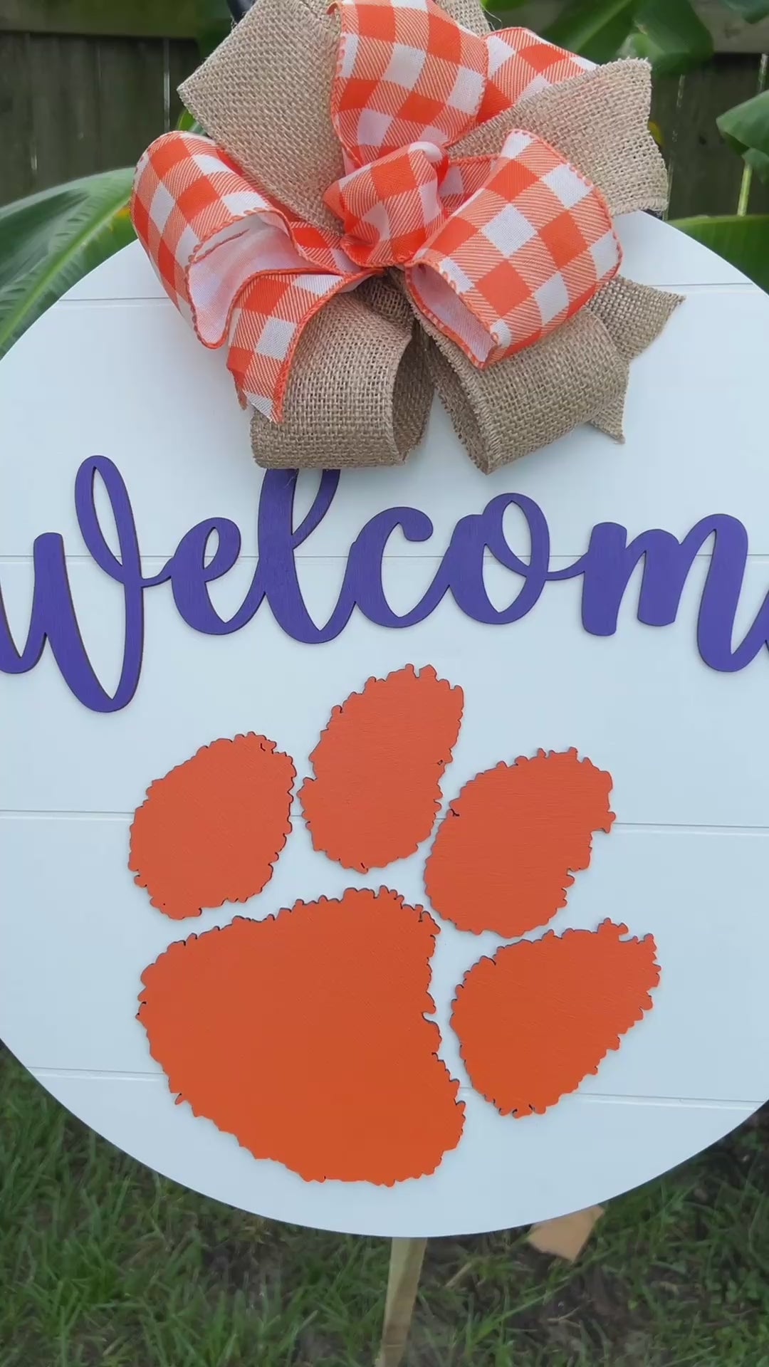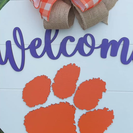 This Clemson-style wood wreath is recently redesigned with a fresh, clean shiplap background that's topped with a tiger paw and "welcome" text in the classic orange and purple colors. The paw and text are layered on top for a 3D look and added visual interest. The burlap and orange plaid bow is the finishing touch.