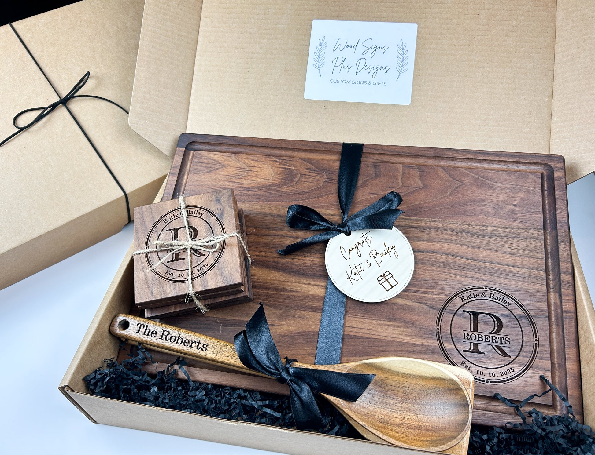 Get a gorgeous, 3-piece engraved wood cutting board gift set. The personalized cutting board set includes an heirloom quality, hardwood cutting board, coordinating wood spoon and turner, and 4 wood coasters -- and it all comes beautifully packaged in a sturdy gift box with decorative crinkle paper, ribbon, and a custom wood gift tag.