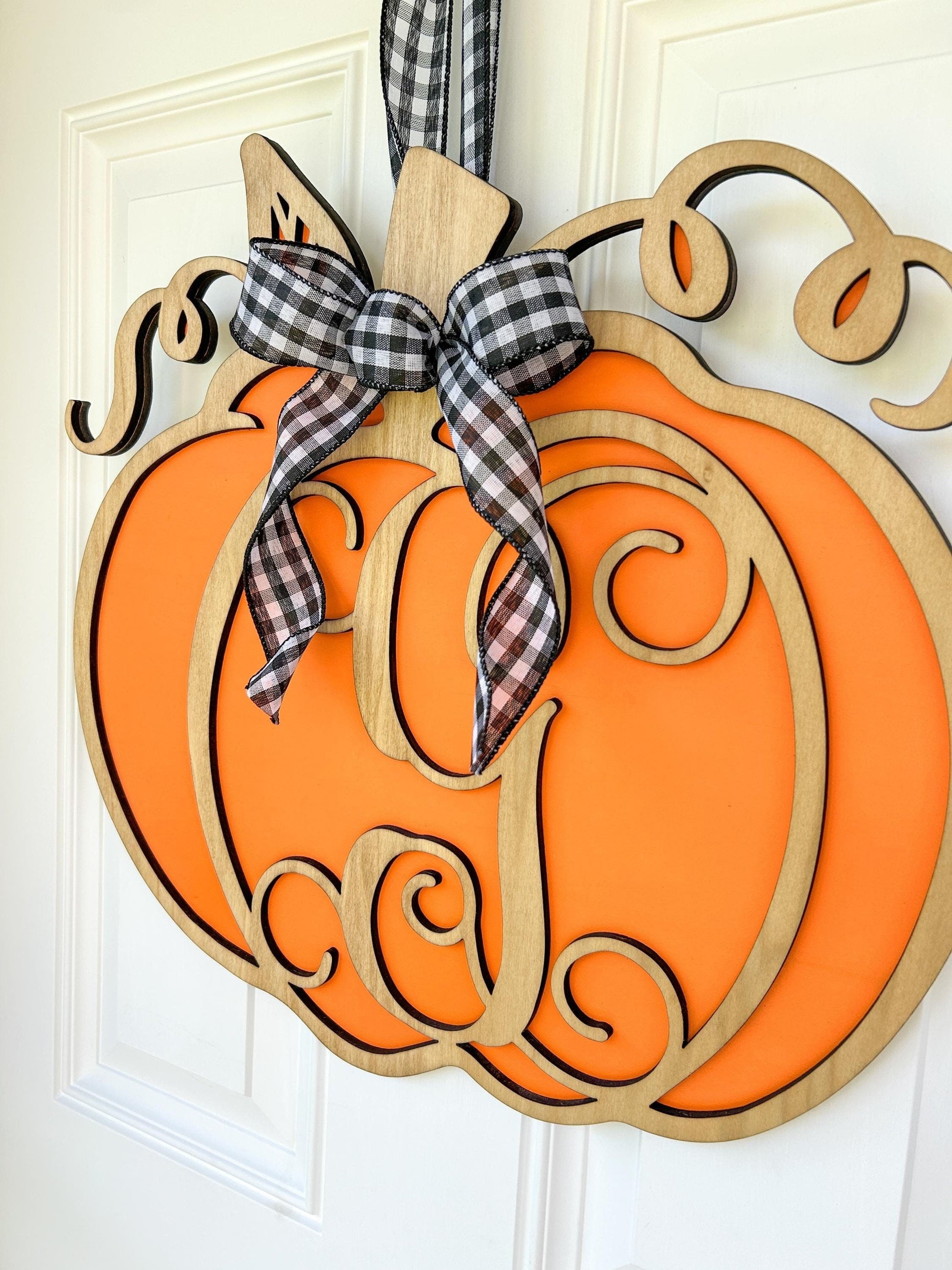 - The pumpkin's accents and the letter are layered on top for a 3D look and are stained a light brown.