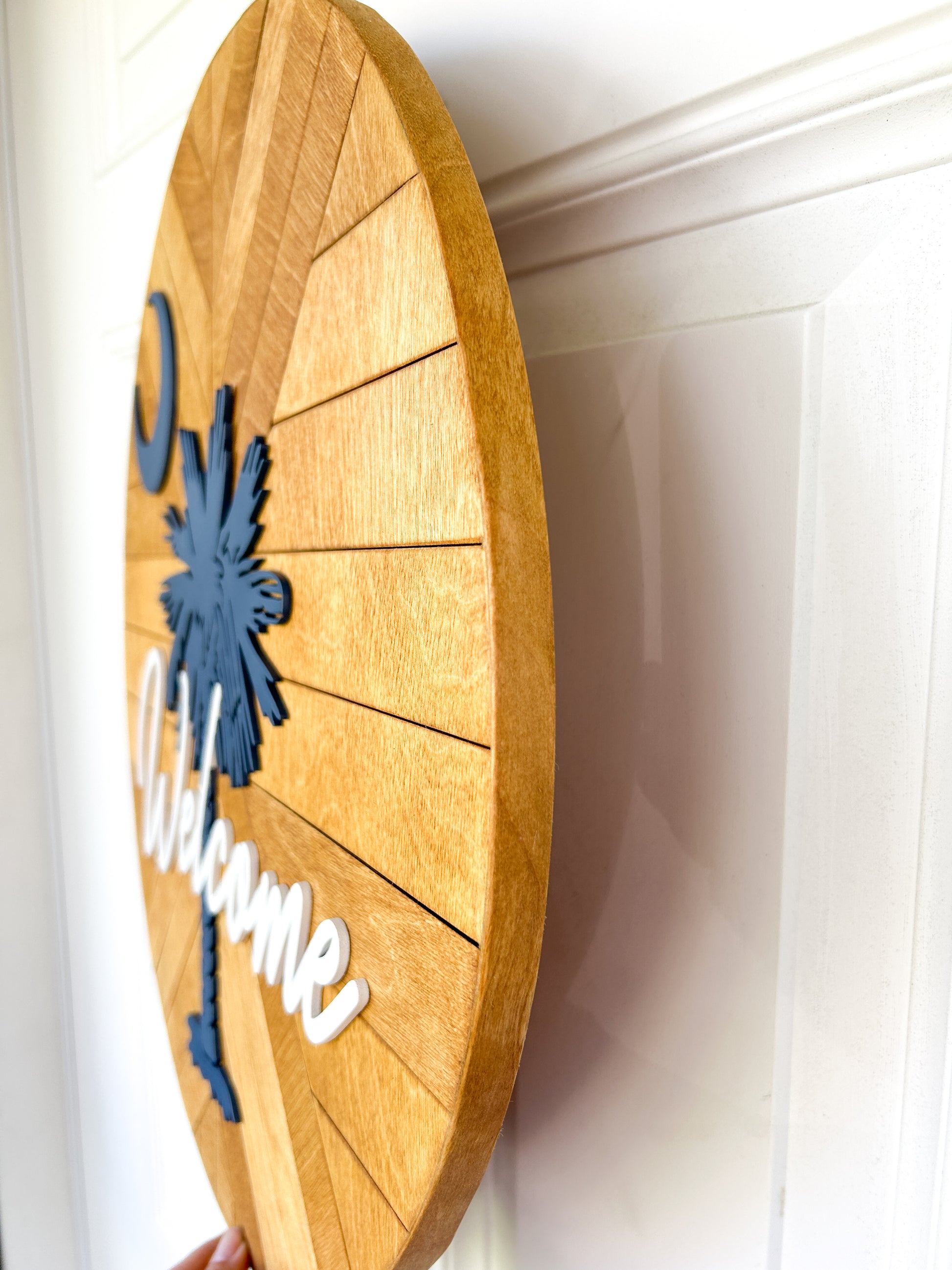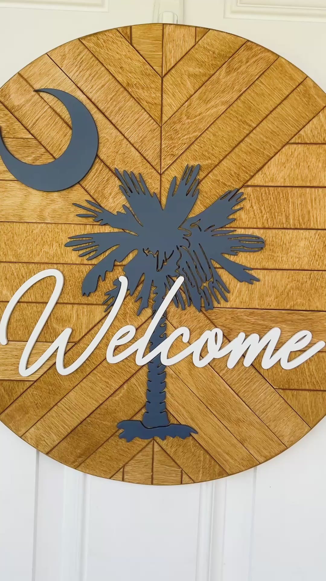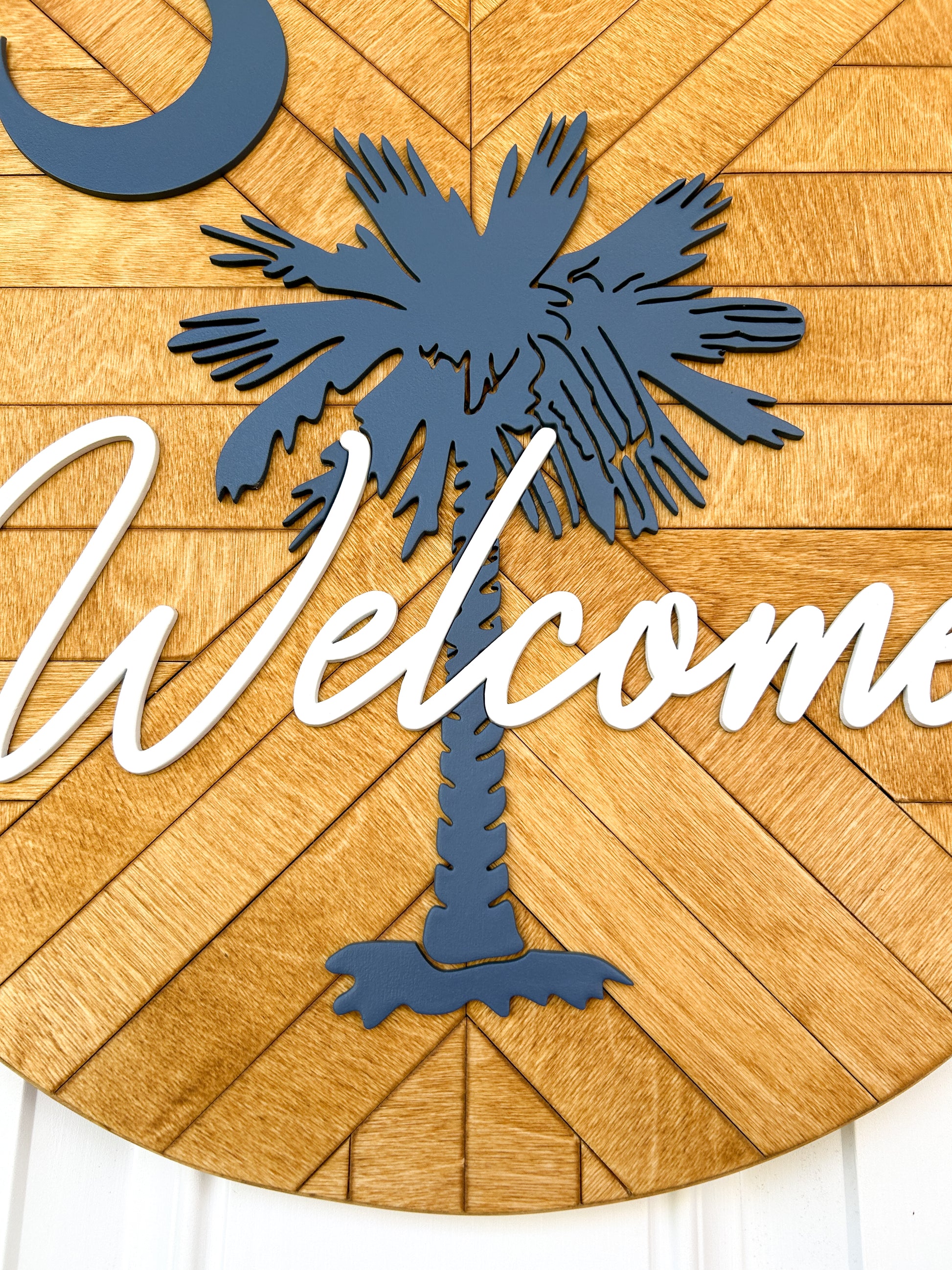 This wooden, South Carolina sign is a real eye-catcher with its wooden, mosaic background against the smooth-painted palmetto tree and welcome text that's layered on top for a 3D look. Use it in place of a traditional door wreath, or use it to decorate your porch or entryway. You also have the option to change the "welcome" text to your last name (or another word) and hang it anywhere in your home, such as above the mantel, etc. This would also make a thoughtful South Carolina gift for anyone who loves the state.